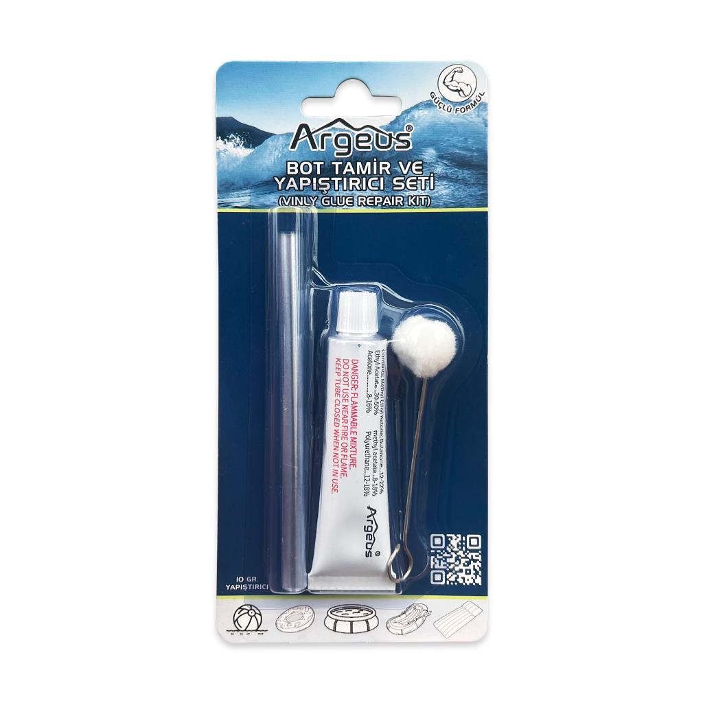Şişme bot, şişme yatak, şişme yüzme ekipmanları ve oyuncakların onarımları için Argeus tarafından özel olarak tasarlanmış bir tamir setidir.