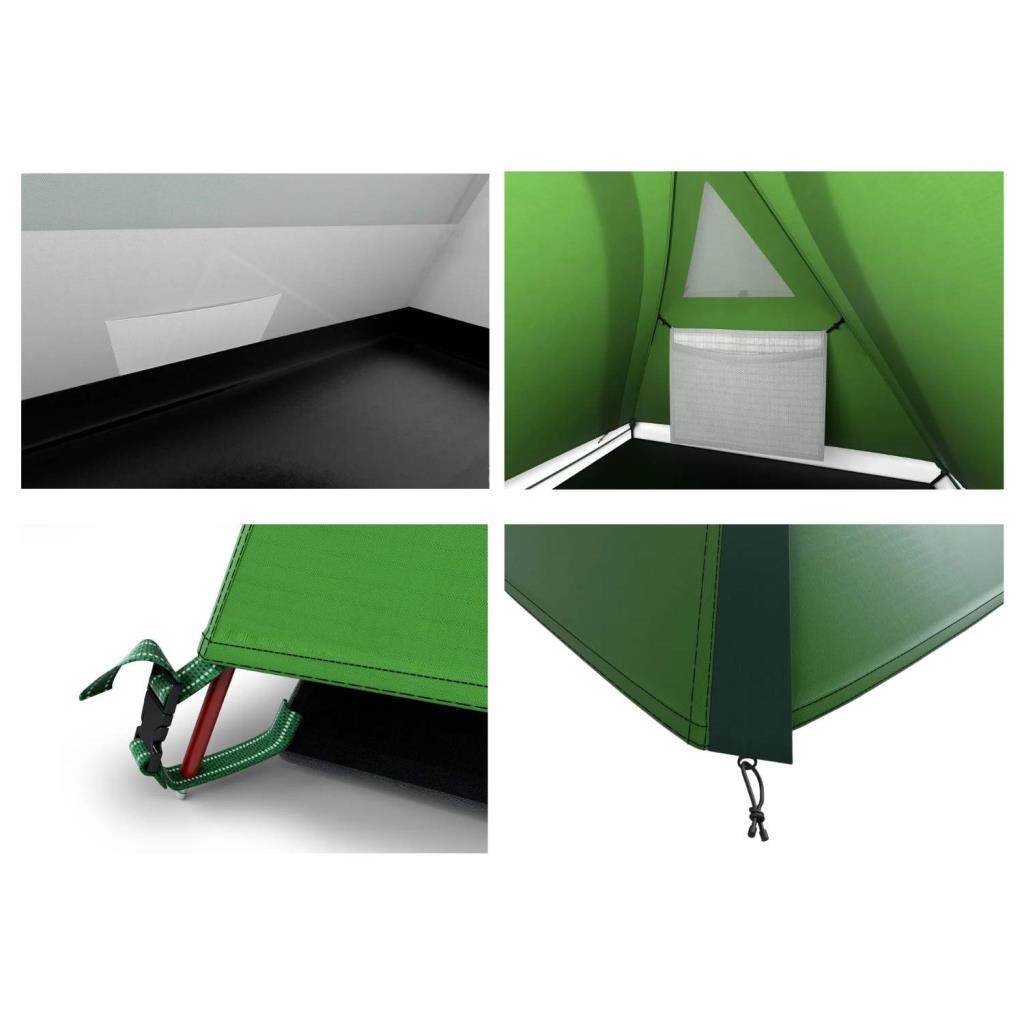Su Geçirmezlik: Dış çadır 6.000 mm H2O su geçirmezlik seviyesine sahip poliüretan kaplamayla korunurken, zemin örtüsü 10.000 mm H2O su geçirmezlik kapasitesine sahiptir.