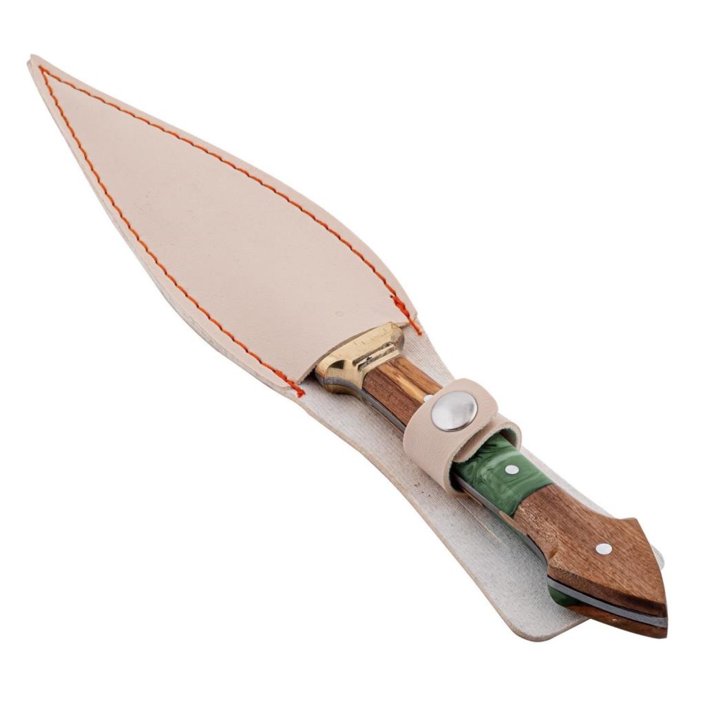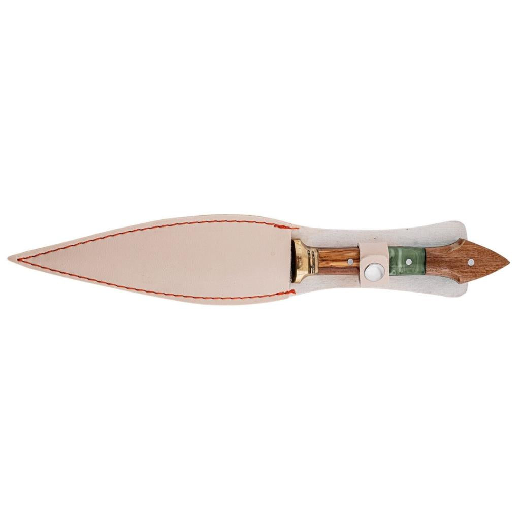 Çift Ağızlı Deri Kılıflı Çerkez Bıçağı, geleneksel el işçiliğiyle modern üretim tekniklerini birleştirir. Şıklığı, işlevselliği ve kültürel değeriyle her zevke hitap eden bu bıçak, koleksiyon değeri taşıyan özel bir parçadır. Haki renkli epoksi sapı ve zarif tasarımıyla doğada ya da sergilemede göz kamaştırır.