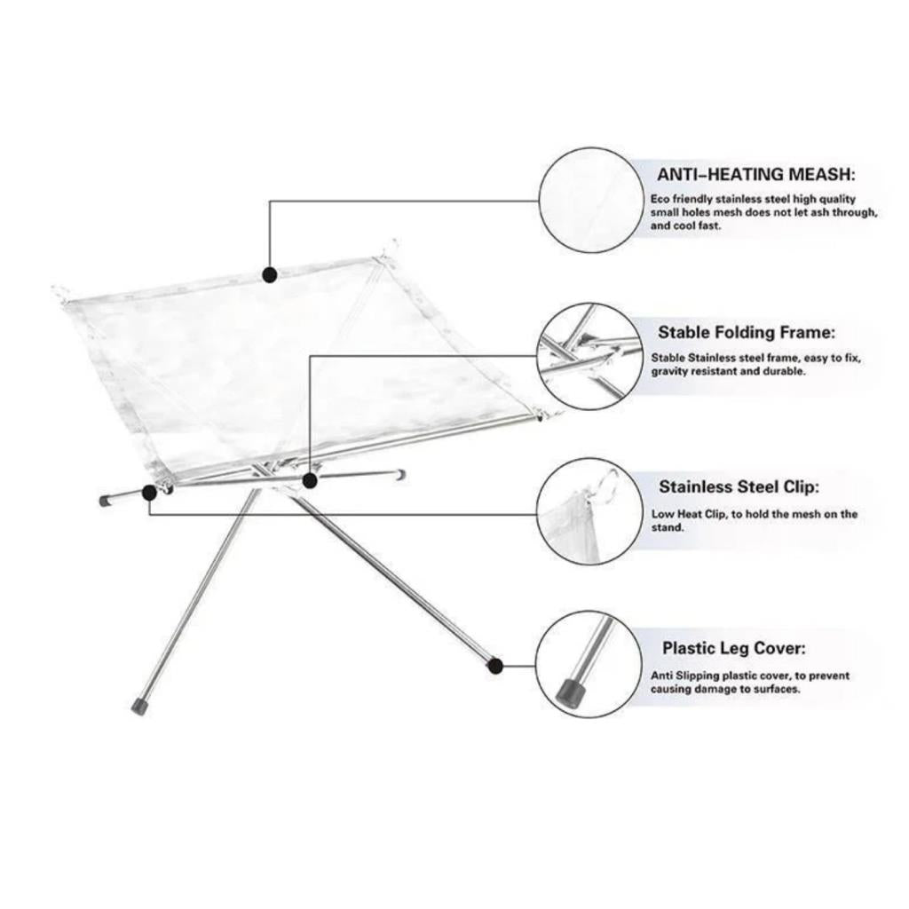Isıya dayanıklı yoğun paslanmaz çelik ağ, döküntülerin düşmesini önlerken uzun ömürlü kullanım sağlar. Dört çelik destek borusu ve plastik ayak kapakları, stabiliteyi artırır ve zemini korur.